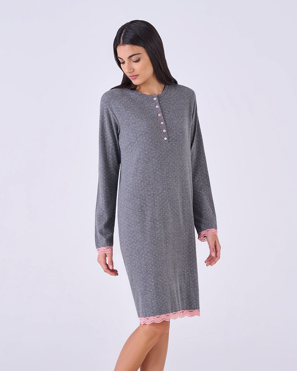 Camicia da notte caldo cotone pois è il capo nightwear perfetto da indossare durante la stagione autunnale e invernale. Il tessuto in cotone risulta morbido al tatto e confortevole. La camicia da notte presenta uno scollo a serafino e maniche e orlo in pizzo.