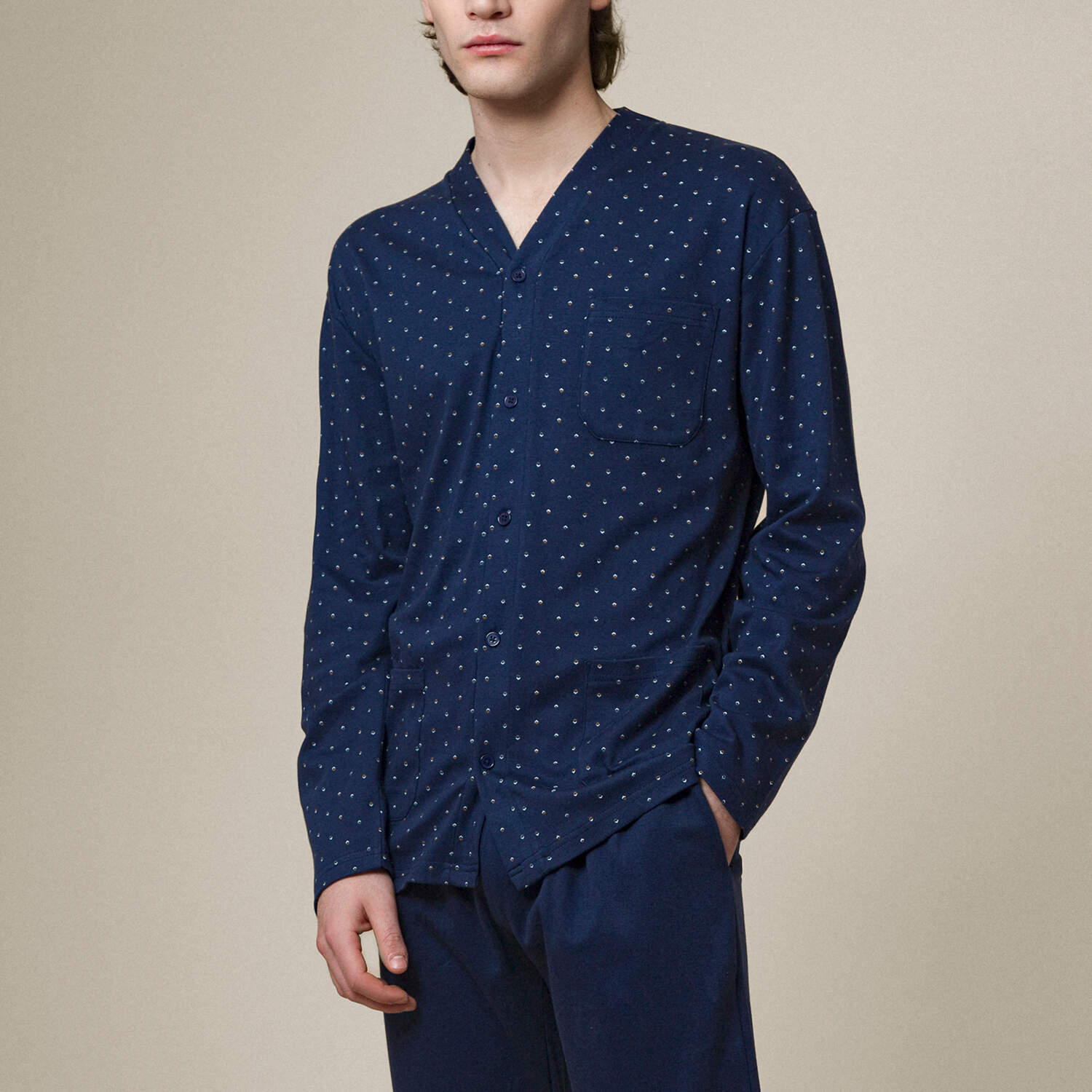 Pigiama uomo in cotone è il capo nightwear perfetto da indossare durante la stagione autunnale e invernale. Il tessuto in cotone risulta morbido al tatto e confortevole. La maglia di questo modello è a serafino e presenta pois.