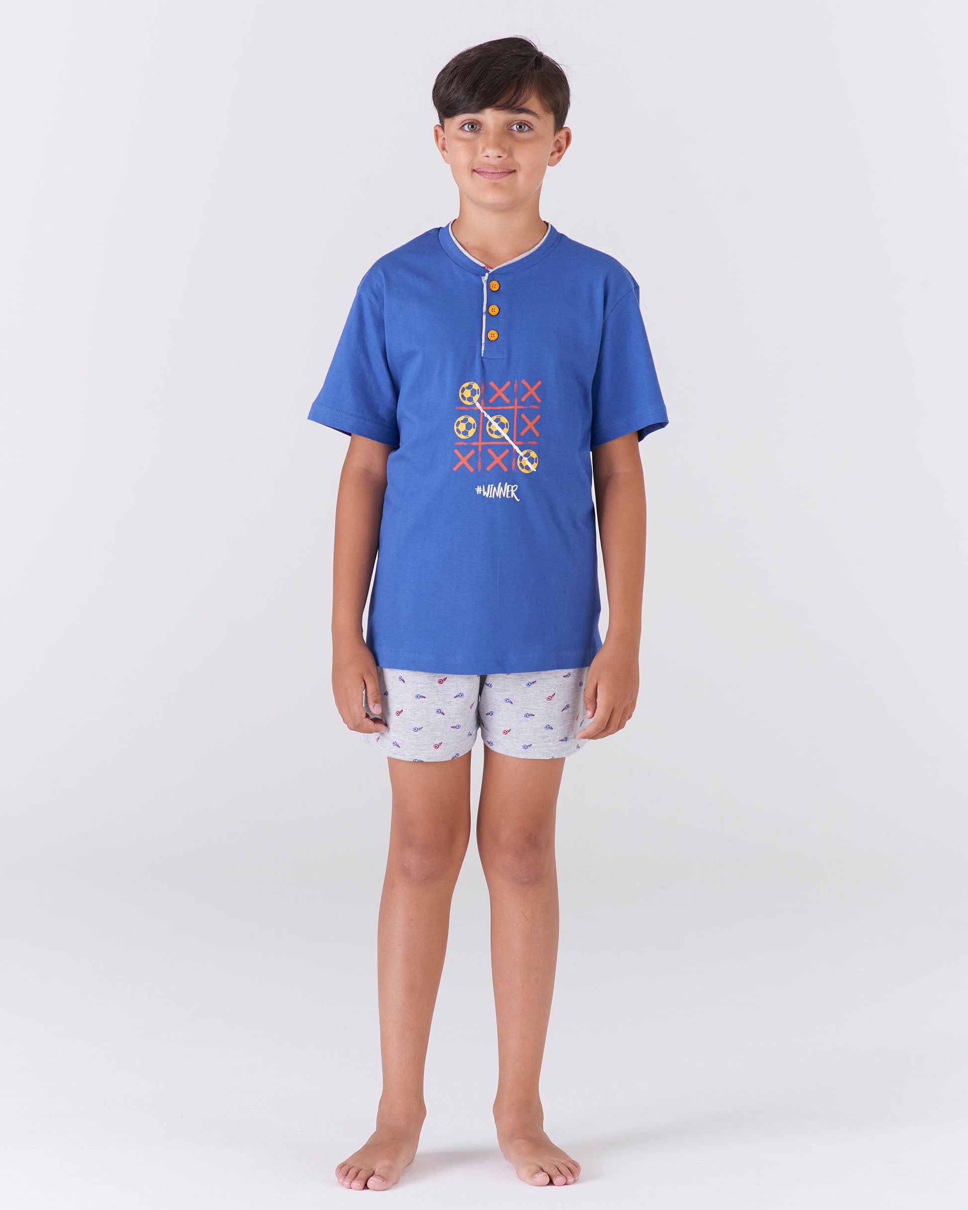 Pigiama corto bambino con pantaloncini e maglia a maniche corte modello serafino con stampa sul petto.