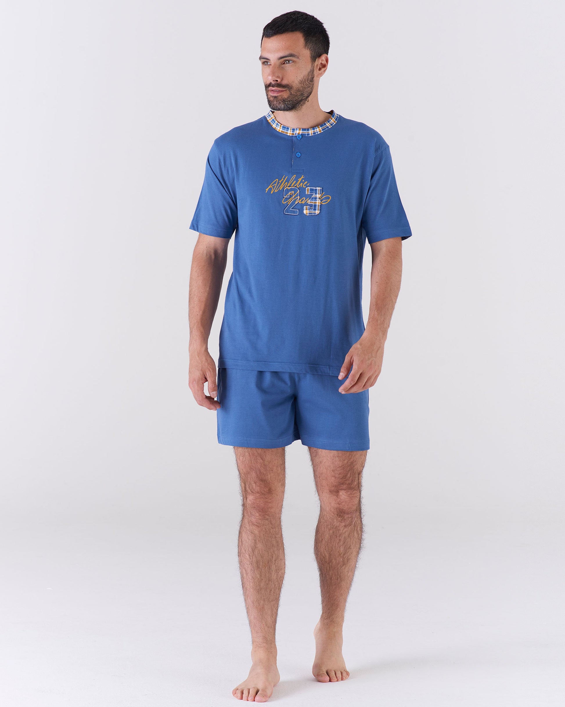 Pigiama corto ragazzo con pantaloncini a tinta unita e maglia modello serafino con stampa sul petto.