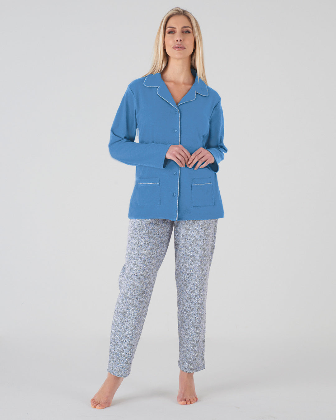 Il pigiama donna aperto caldo cotone fiorellini è il capo nightwear perfetto per la stagione autunnale e invernale. La maglia di questo modello è aperta. Il pantalone presenta una fantasia con fiorellini.