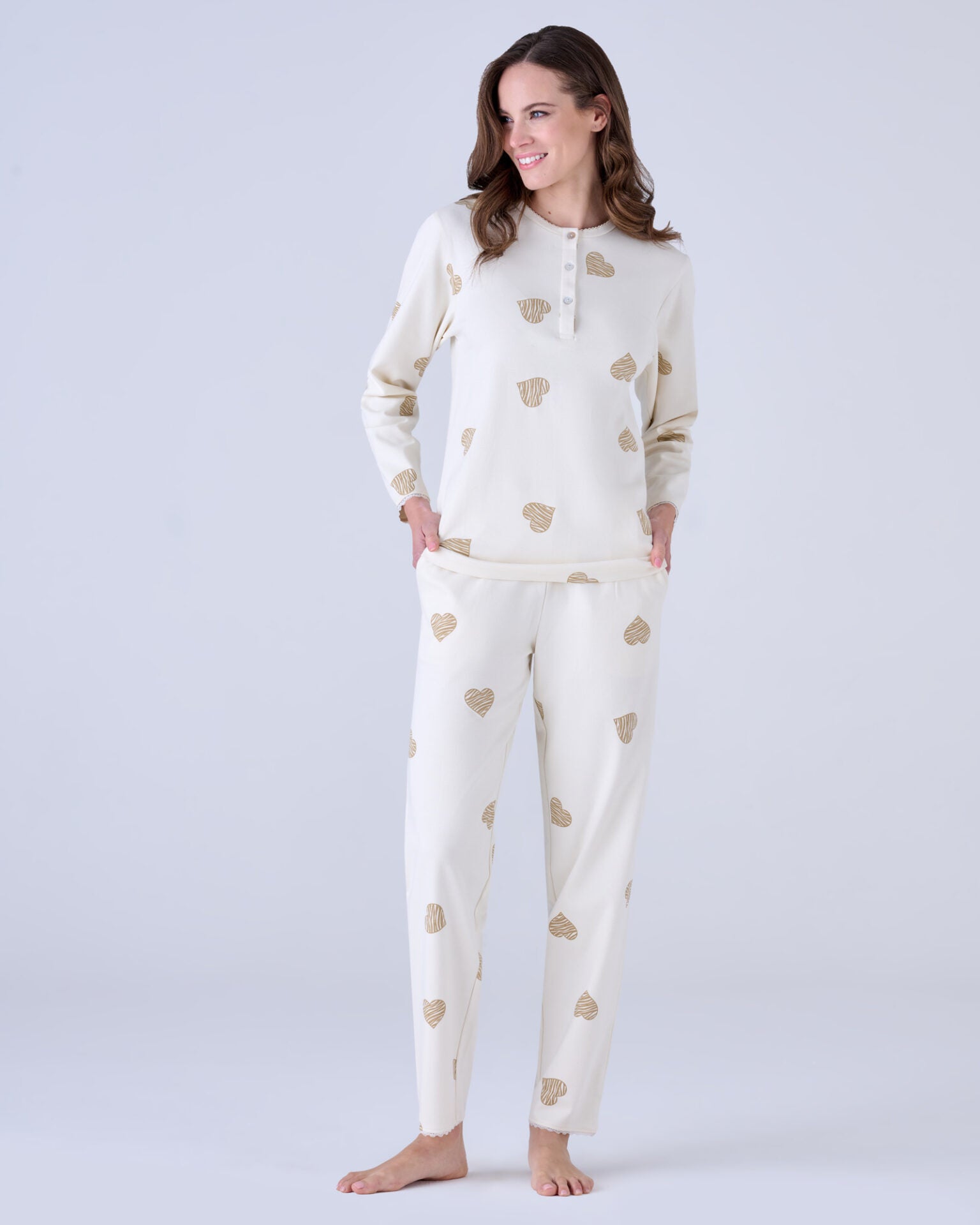 Scopri il nostro Pigiama Donna Fantasia Cuori, un capo pensato per tutte le donne che desiderano unire comfort e stile nelle loro notti. Realizzato in morbido tessuto interlock, questo pigiama è ideale per coccolarti e mantenerti al caldo durante le serate più fresche. La parte superiore e inferiore sono decorate con una deliziosa fantasia a cuori in tonalità beige, che aggiunge un tocco di romanticismo e dolcezza al tuo abbigliamento da notte.