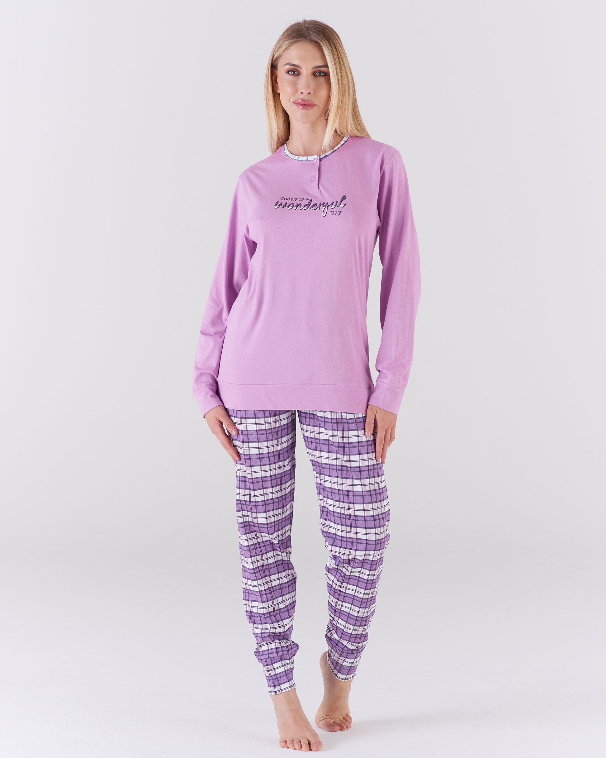 Pigiama lungo ragazza con pantalone a fantasia e maglia a tinta unita con stampa sul petto.