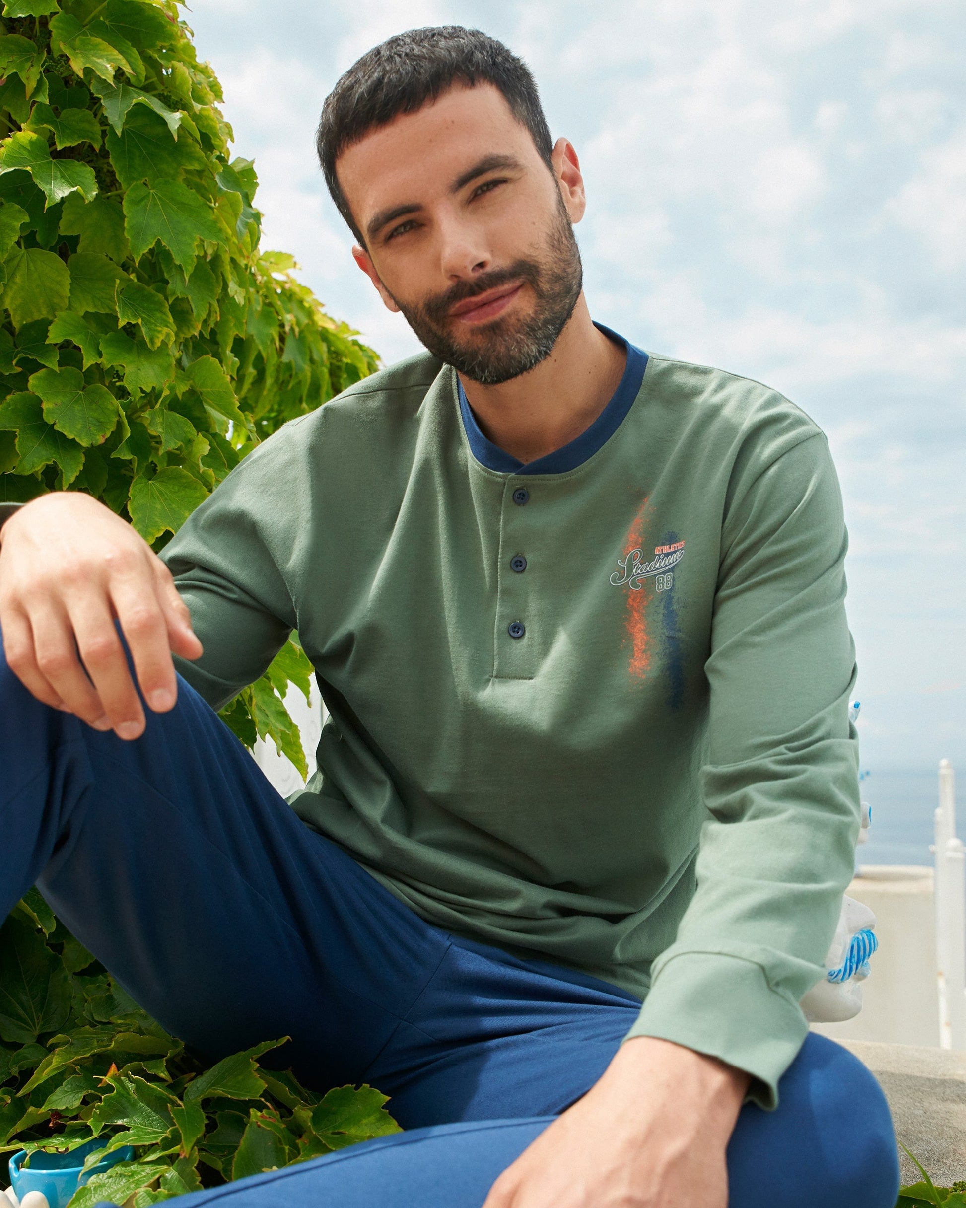 Pigiama lungo uomo con pantalone con polsini e maglia modello serafino con colore a contrasto.