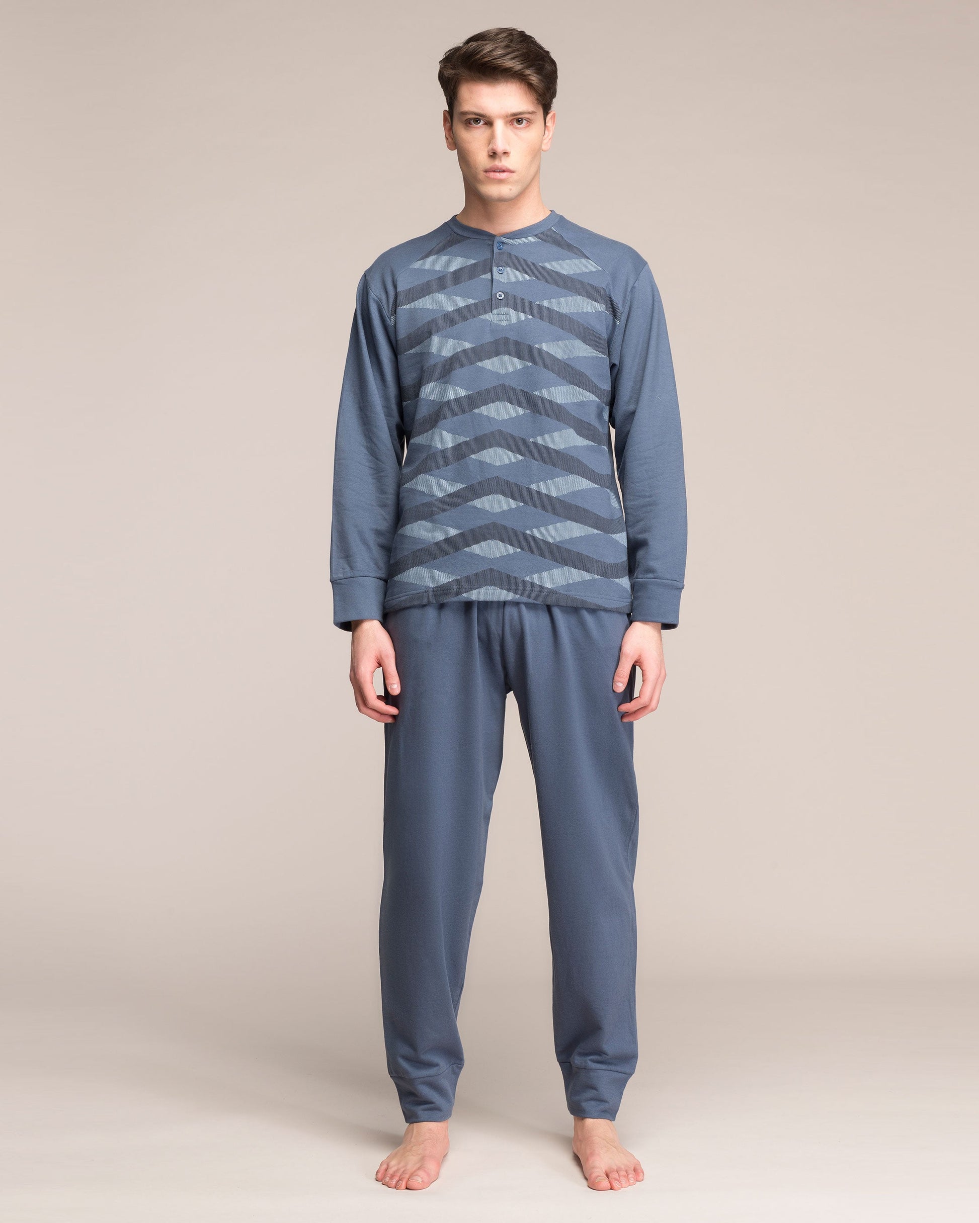 La maglia modello serafino con tre bottoncini presenta dei comodi polsini, mentre il pantalone lungo, in tinta unita, è dotato di polsini alle caviglie ed elastico in vita.