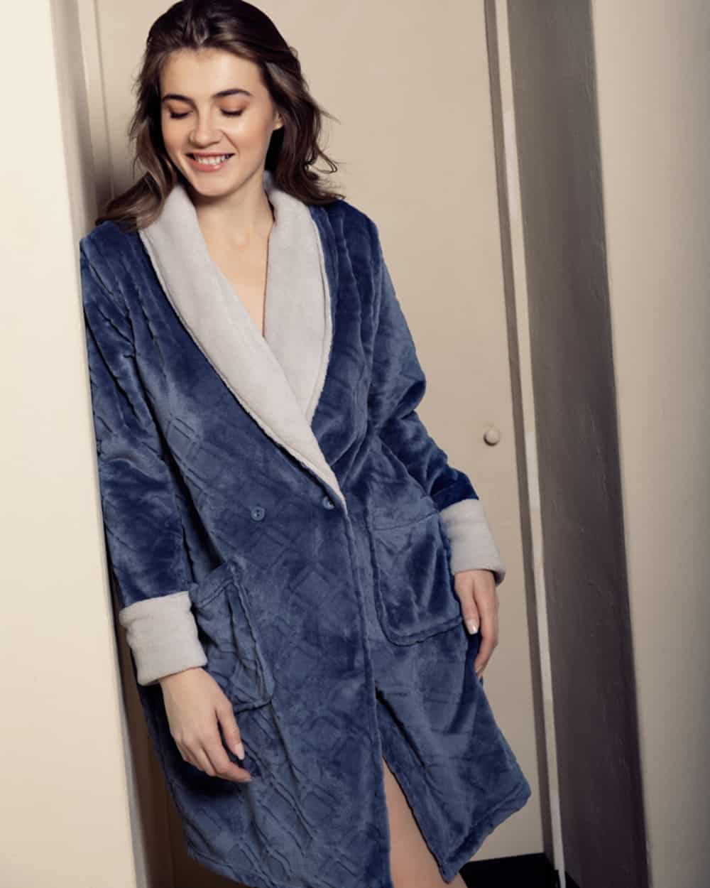 Vestaglia trama con rombi in coral fleece è il capo perfetto da indossare durante la stagione autunnale e invernale. Il tessuto risulta morbido al tatto e confortevole. Vestaglia modello giacca con bottoni, collo in pelliccia e fantasia rombi.